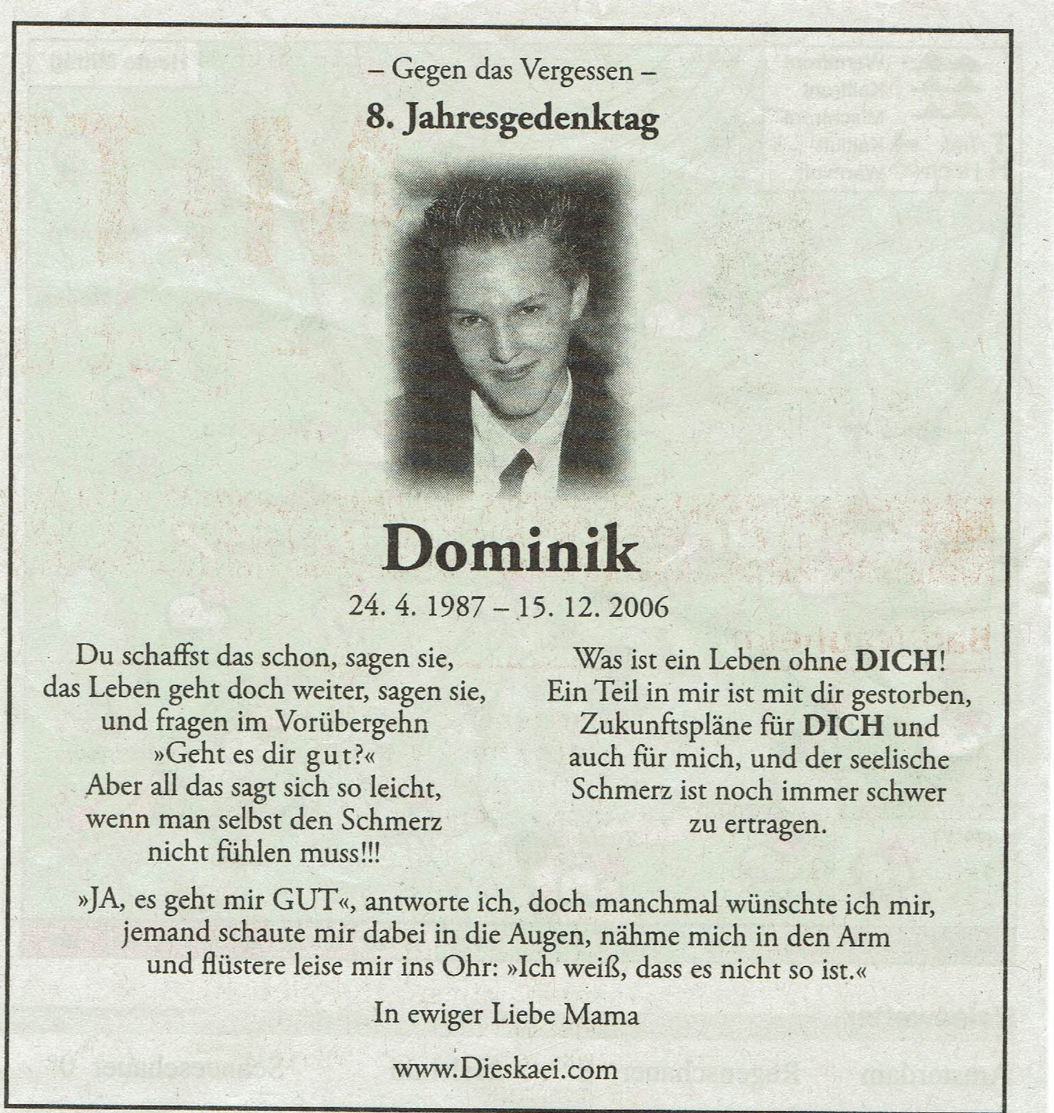 jetzt ist es schon oder auch erst 8. Jahre her, seit dem du von einer Fahrt ins Kino nicht mehr zurückgekommen bist.